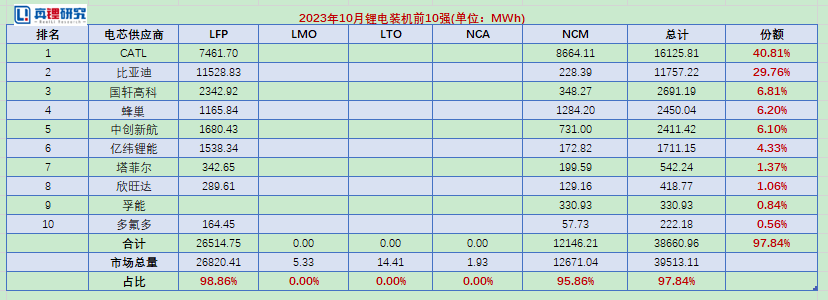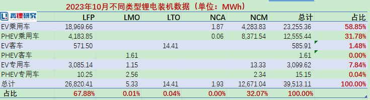 从各类型锂电装机情况来看,2023年10月份三元电池(NCM)装机12.67GWh,占比32.07%,主要应用在乘用车领域。磷酸铁锂电池(LFP)2023年10月份实现装机26.82GWh,占比67.88%,延续了市场的主导地位。从十月份的装机情况来看,市场需求的增长比较温和,整个四季度很难再出现往年装机猛增的情况。