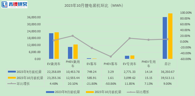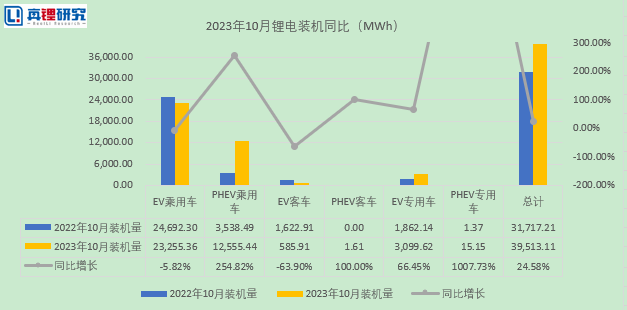真锂研究的数据显示,2023年10月份中国电动汽车市场锂电总装机量39.51GWh,同比上升24.58%。从各细分市场看,EV乘用车仍是最大的细分市场,该市场10月份装机23.26GWh,同比下降5.82%,占比58.85%,PHEV乘用车占比31.78%。从10月份的装机情况来看,动力电池产量10月开始持平,预计11-12月数据都不会有大的起色,但储能电池到了年底需求还会有所表现。从产业链角度来看,2024-2025年整体的需求还在按照正常的速度成长,但相较于疯狂的扩产行动,需求的增速无法填补产能过剩的坑。从电池企业来看,活下去成为近两年的主题。