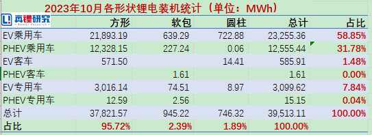 从各形状锂电装机情况来看,2023年10月方形电池装机37.82GWh,在10月份总装机量中占比为95.72%。软包电池装机0.95GWh,占比2.39%,圆柱电池装机0.75GWh,占比1.89%,相较于2023年9月份,软包、圆柱电池占比有所下降。